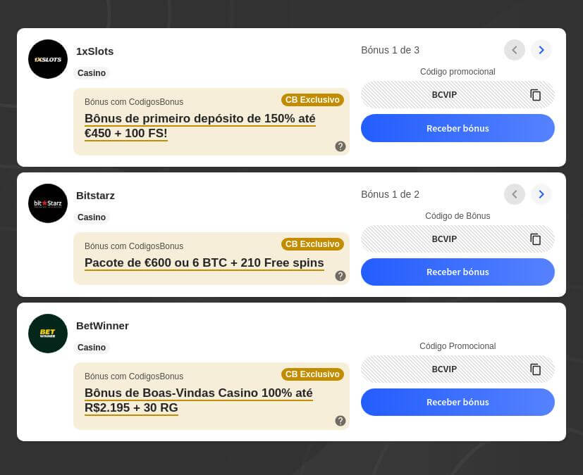 A BetWinner possui um site bastante completo, oferecendo também, apostas esportivas das mais variadas competições ao redor do mundo com odds competitivas. Na seção de cassino, são mais de 1.000 jogos e bônus generosos, com um destaque para o pacote de boas-vindas VIP que é oferecido ao se inscrever na casa de apostas com nosso código.